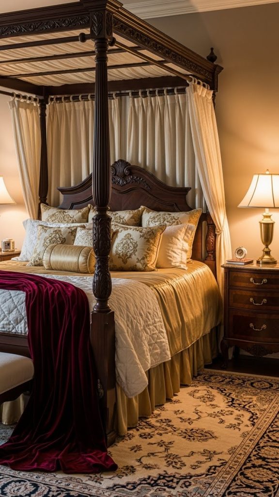 Creating a luxury master bedroom with antique elements is a journey of combining elegance, comfort, and timeless design. From grand antique furniture to ornate lighting, textured walls, and layered bedding, each detail contributes to the overall aesthetic.