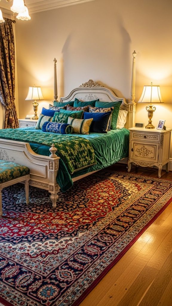 Flooring can tie the antique look together. Hardwood floors with rich tones like walnut or cherry create a warm foundation. To add softness and elegance, place Persian rugs or Oriental carpets under the bed or in seating areas. These rugs provide color, texture, and a luxurious touch that complements antique furnishings.