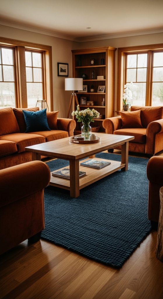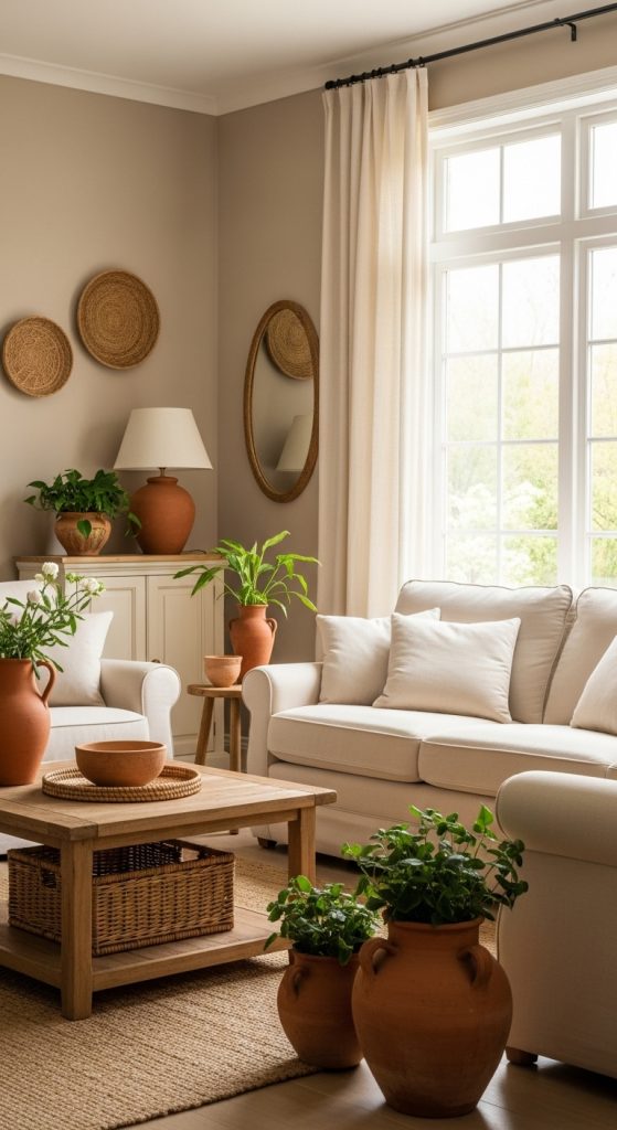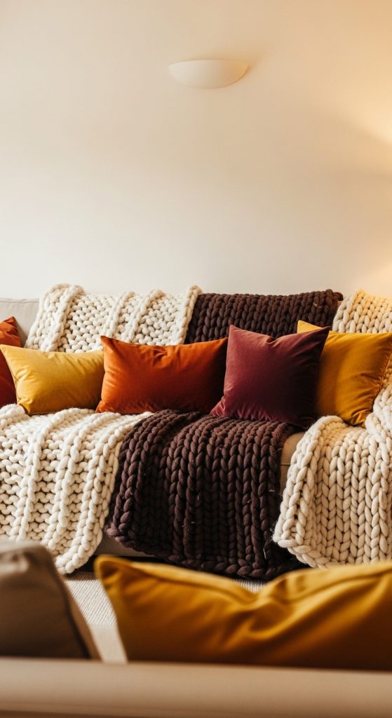 Tip: Stick to warm tones like rust, beige, and deep greens, and mix textures for added depth.