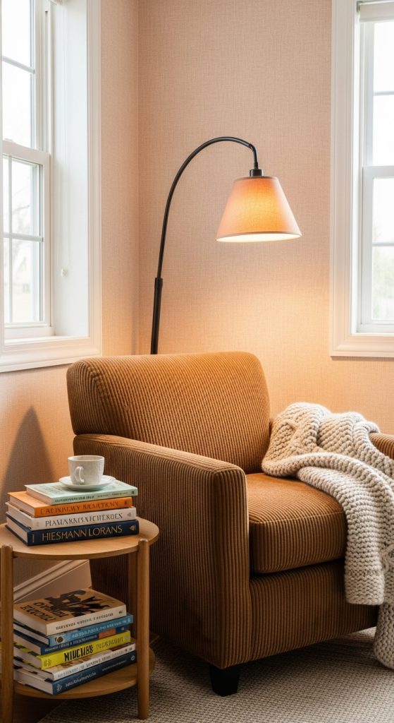 Design a small corner with a comfy chair, floor lamp, and small shelf or basket of books.