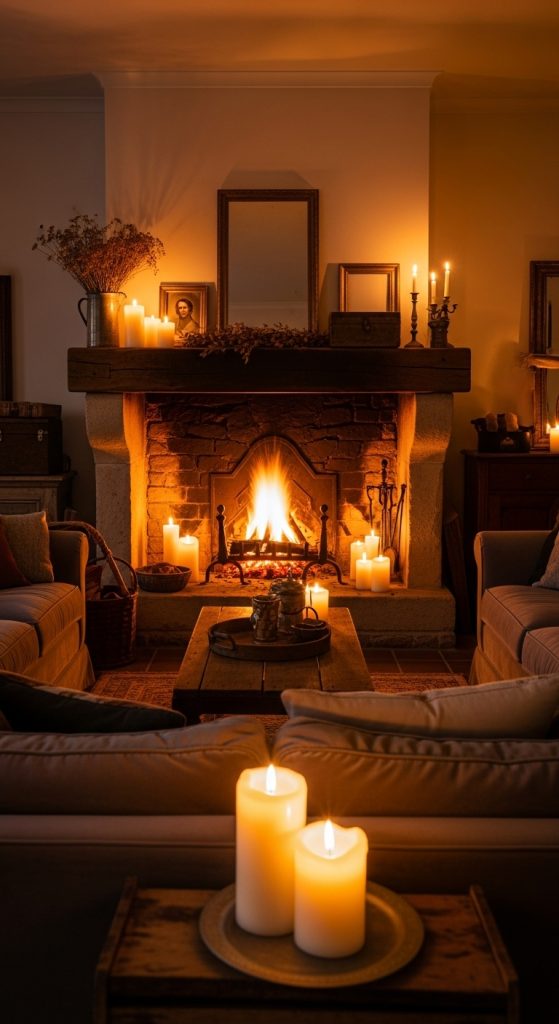 If you have a fireplace, style the mantel with seasonal décor, candles, and framed prints. If not, consider an electric or faux fireplace for the same cozy effect.