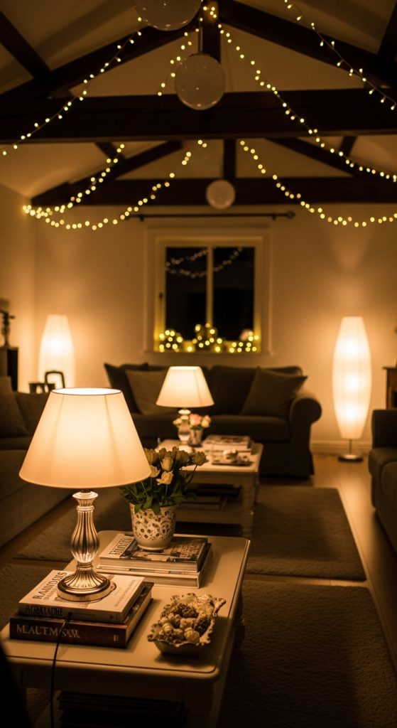 Lighting makes a huge difference in coziness. Skip harsh ceiling lights and add floor lamps, table lamps, and string lights.