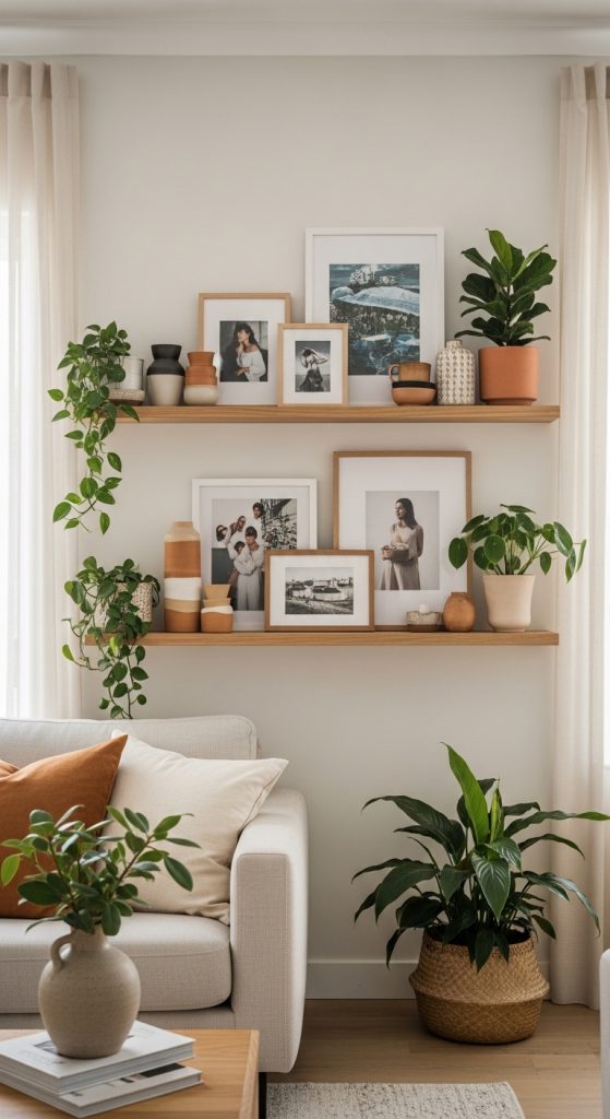 Use floating shelves instead of directly hanging your art. This allows you to layer frames, add small plants or objects, and easily swap pieces out.