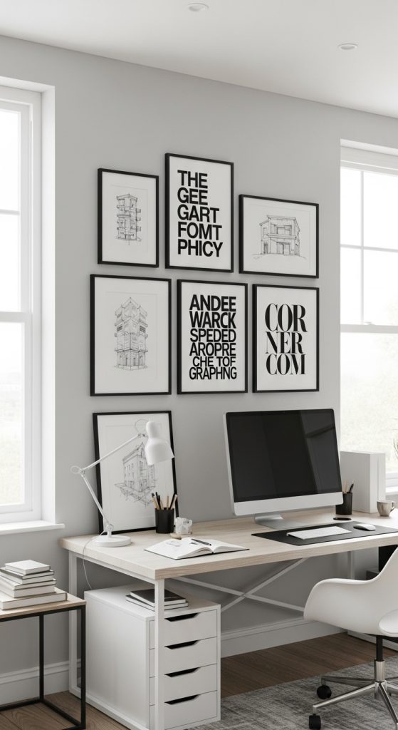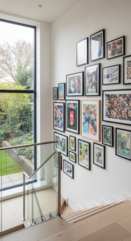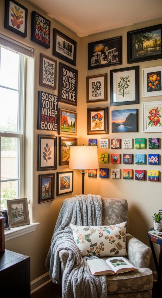 Combine different frame styles, sizes, and art types (paintings, quotes, drawings). Place them in a loose arrangement that feels balanced but not overly structured.