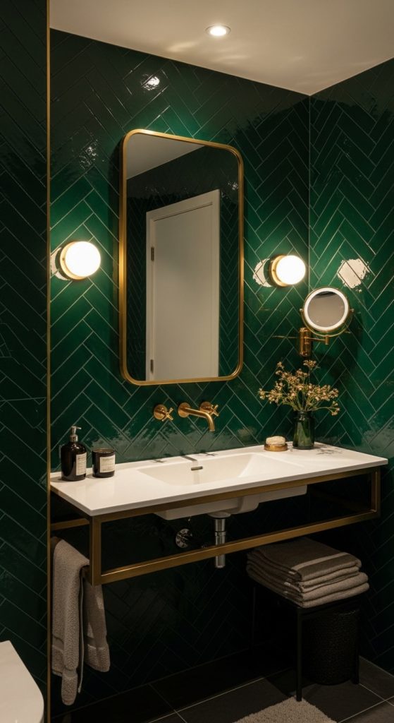 Choose deep green glossy tiles in a vertical herringbone for a bold, nature-inspired look. Pair with wood accents or brass fixtures for a balanced aesthetic.