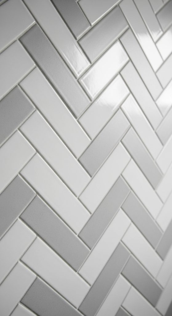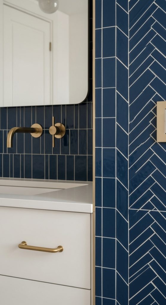 Highlight the pattern by choosing contrasting grout—like charcoal with white tiles or cream grout with navy tiles—to make the vertical herringbone really pop.