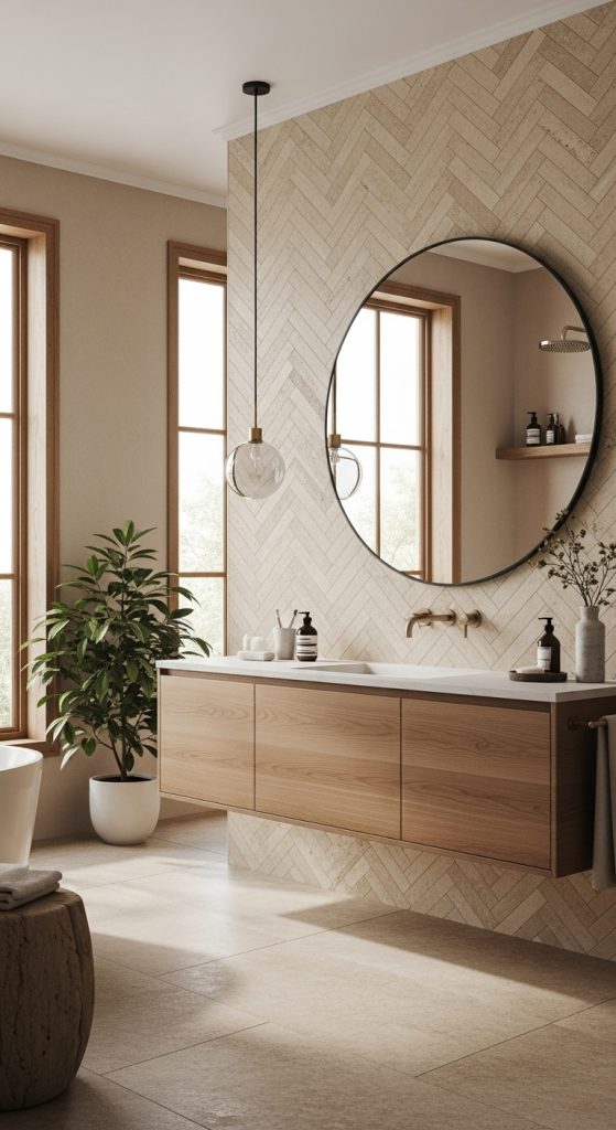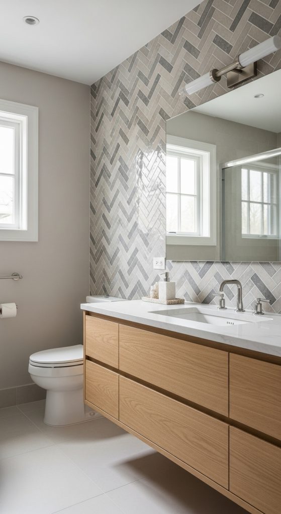 Beige or taupe tiles in a vertical herringbone layout deliver warmth and sophistication without overpowering the space. Combine with natural textures like wood vanities or woven baskets.