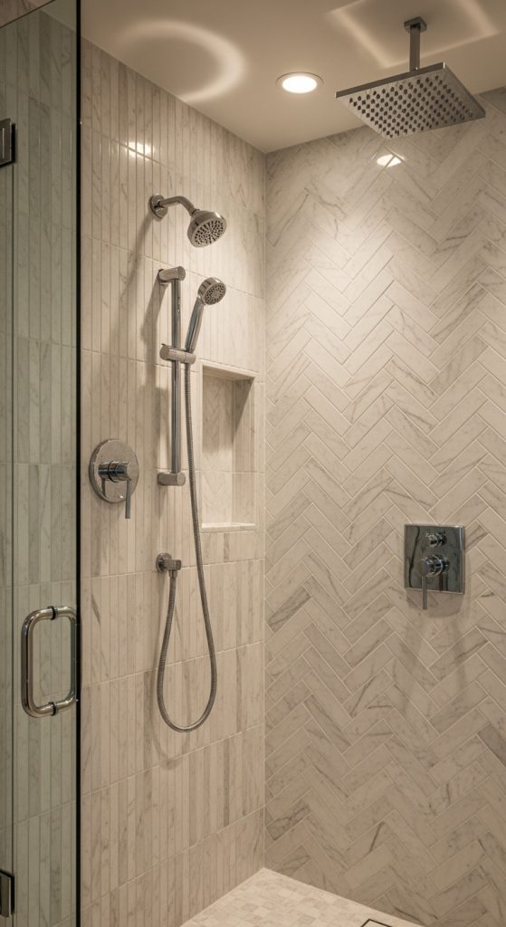 The herringbone pattern, with its classic V-shaped layout, adds texture, dimension, and luxury to bathroom spaces. When arranged vertically, it creates a sense of height and visual interest, making even small bathrooms feel more spacious and stylish.