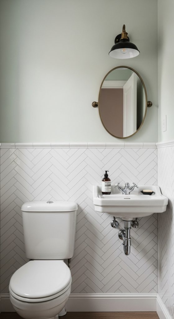 Instead of tiling the entire wall, apply the herringbone pattern only halfway up the wall (or as a backsplash) for subtle style. Top it with paint or wallpaper above for added contrast.
