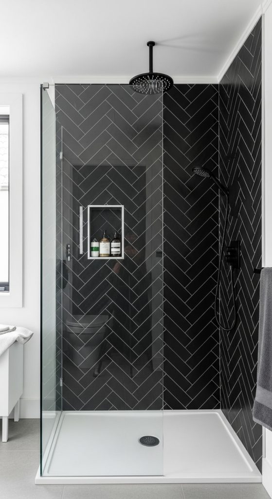 Go dramatic with matte black herringbone tiles arranged vertically inside the shower area. It adds edge and contrast, especially when paired with white grout and glass enclosures.
