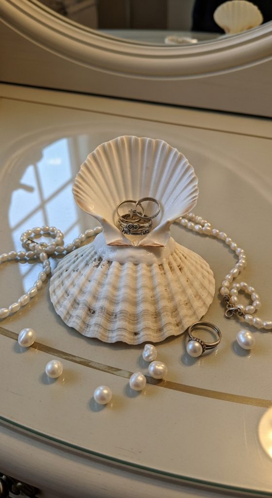 Glue two scallop shells together at an angle to form a little cradle or stand. Add a small decorative base to hold rings upright or as a decorative item on a dresser.