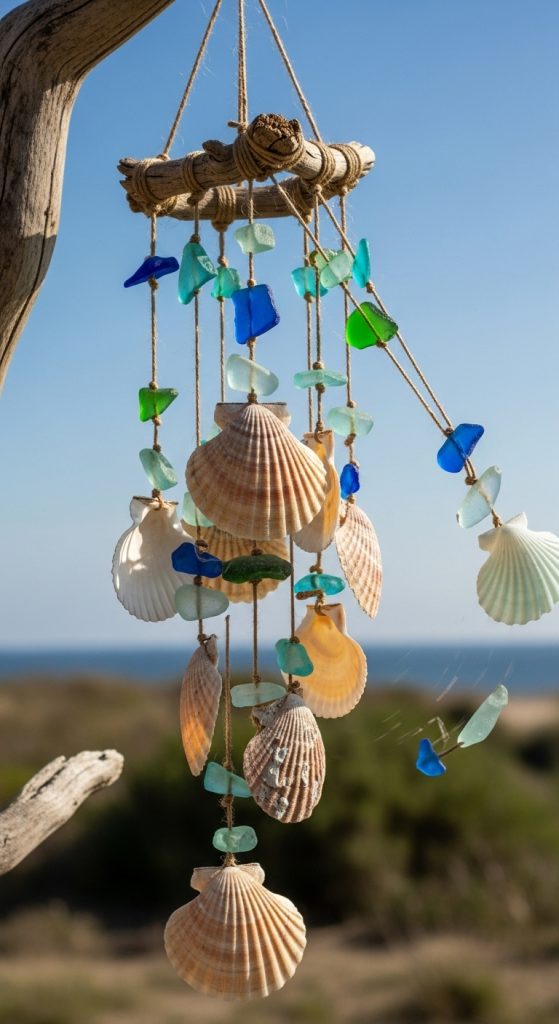 Combine scallop shells with other sea treasures like small conch shells and sea glass. Hang them from a driftwood stick using fishing line or thin twine to create a breezy coastal wind chime.
