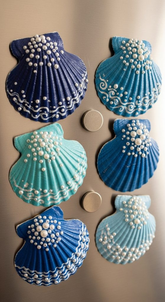 Attach strong magnets to the backs of painted scallop shells. Add small decorations like pearls, rhinestones, or beach-themed stickers for extra flair.