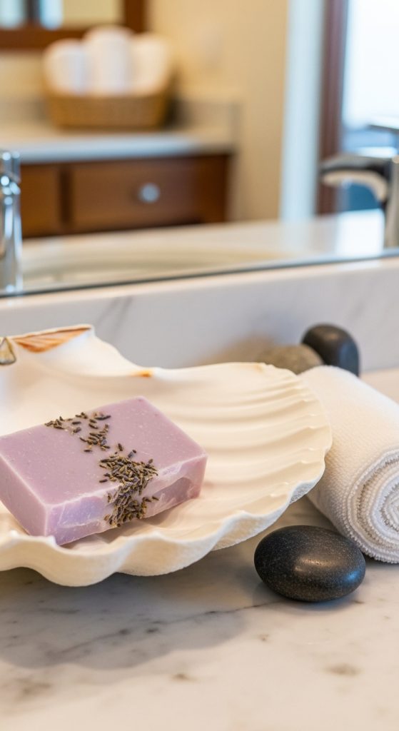 Use large scallop shells as charming soap dishes in the bathroom or kitchen. Seal them with waterproof varnish to keep them durable and easy to clean.