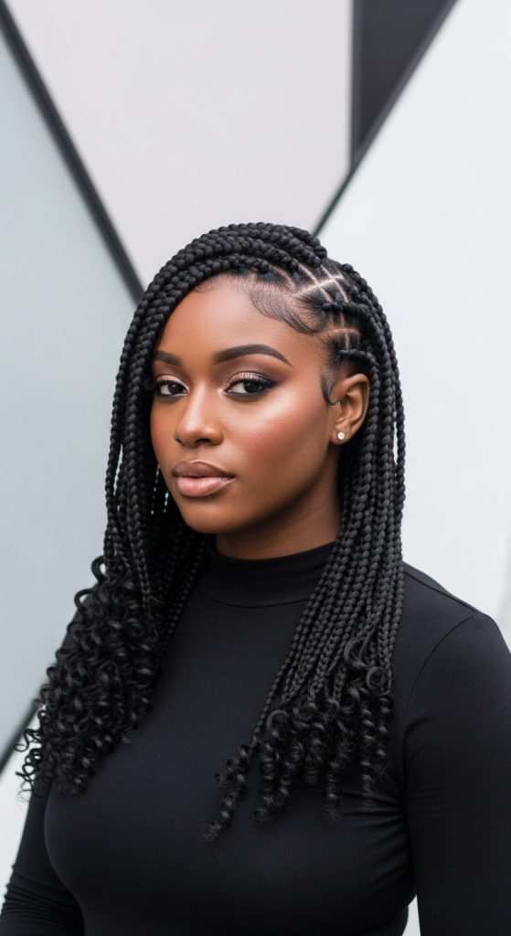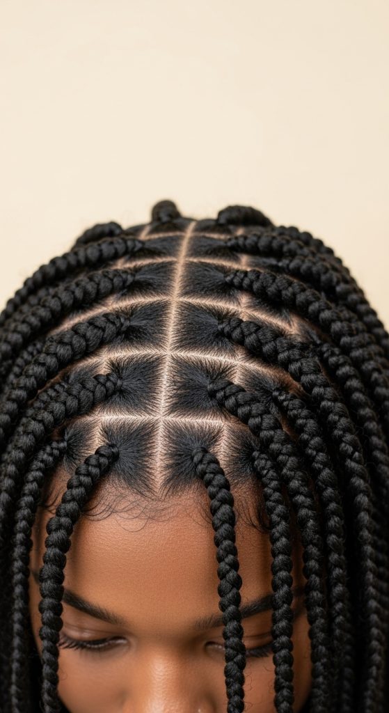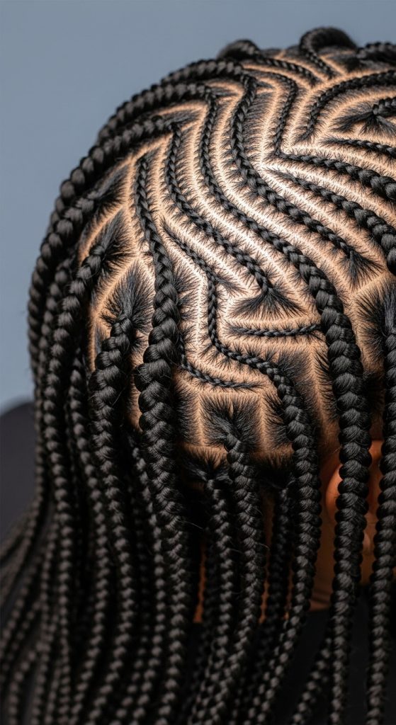 Instead of straight lines, twist the hair in zig-zag or creative patterns across the scalp. Bold and artistic.