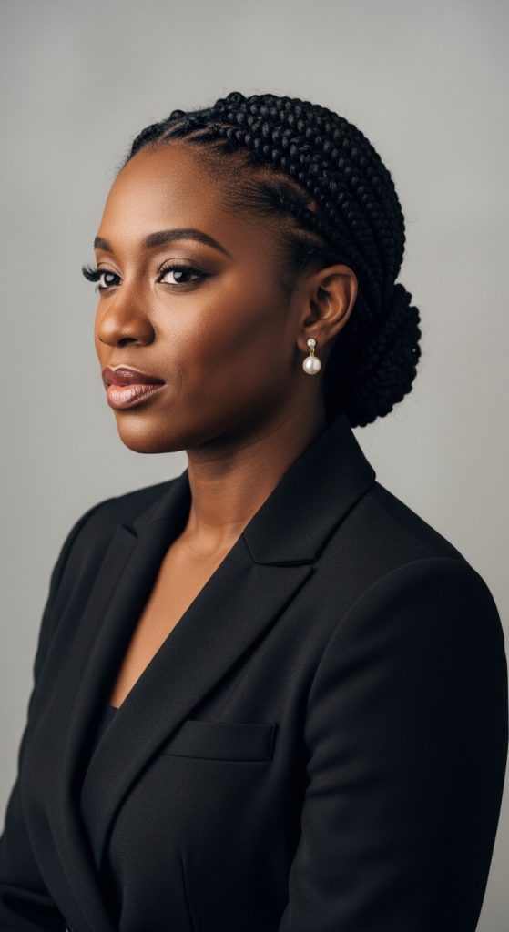 A clean, sophisticated look that’s perfect for professional settings. Twist the sides tightly toward the back and gather them into a neat low bun.